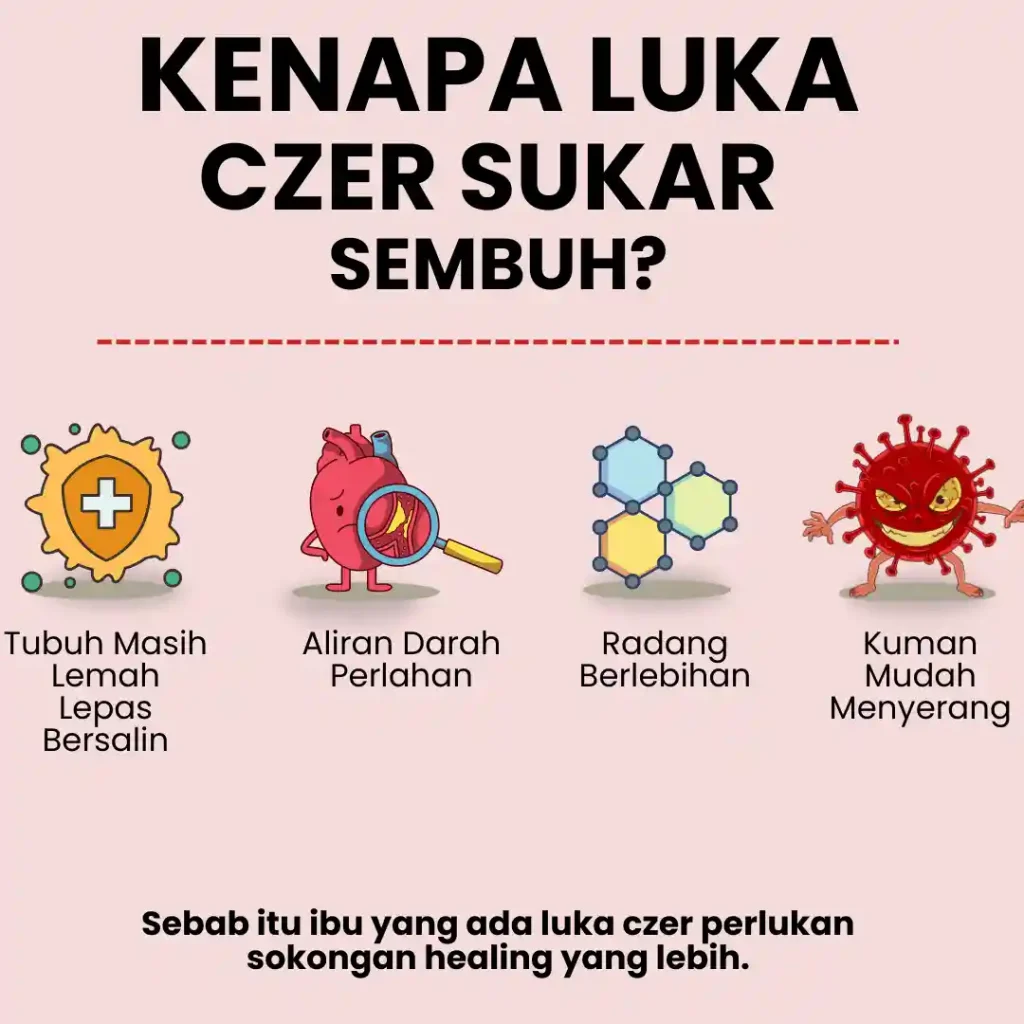 Lepas czer, badan ibu masih trauma. Luka perlukan sel baru cepat terbentuk, tapi badan penat & imun lemah,sebab tu luka lambat sembuh.