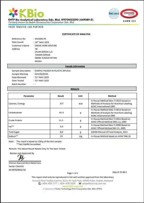 Formulasi Harbio guna bahan semulajadi seperti ekstrak ikan haruan & kurma ajwa, tanpa hormon sintetik atau bahan terlarang.