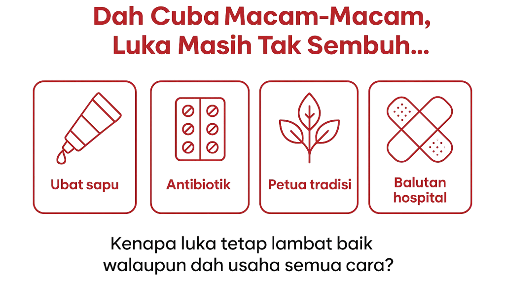 Ubat sapu, herba, petua orang tua, tapi luka masih sakit & lambat baik