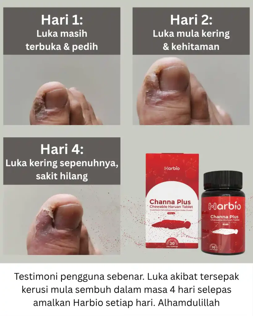 Walaupun ini luka akibat tersepak kerusi, ia bukti Harbio bantu luka tutup 3-4x lebih cepat dari biasa.
